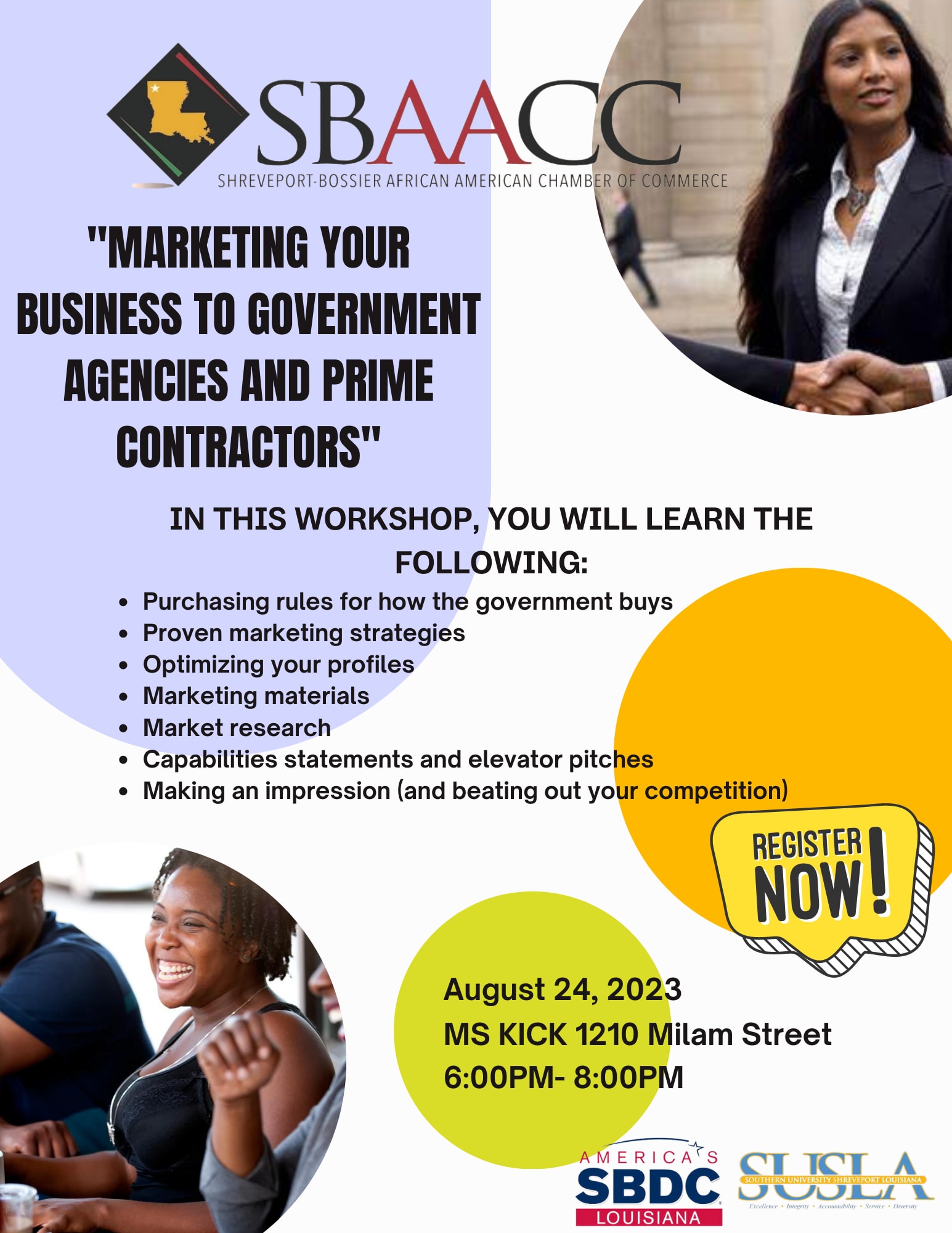 In this workshop you will learn government purchasing guidelines, proven marketing strategies, how to optimize your profiles, and much more!